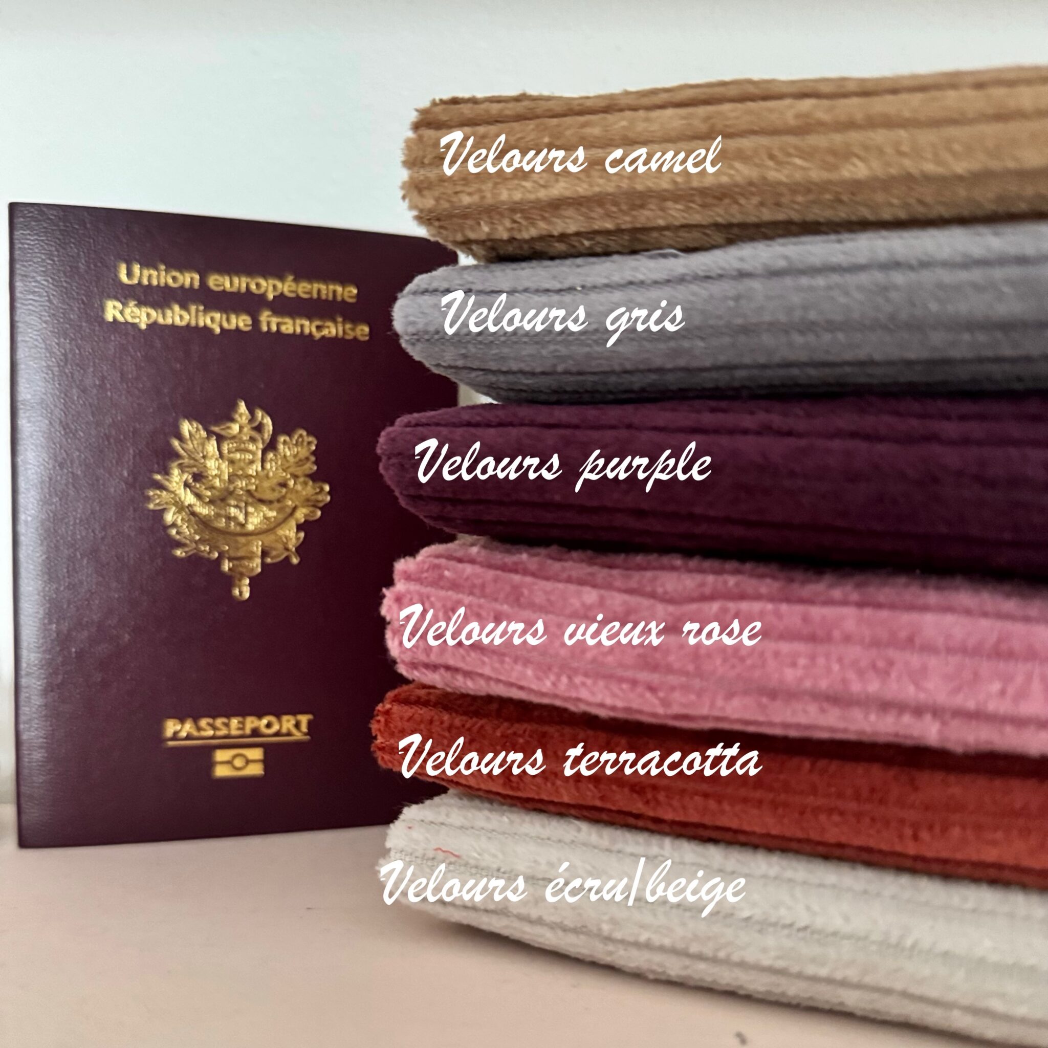 Chaque modèle est réalisé en petite série, dans un choix de velours haut de gamme, aux teintes profondes ou douces, selon la saison et l’inspiration. Le format est compatible avec les passeports français.